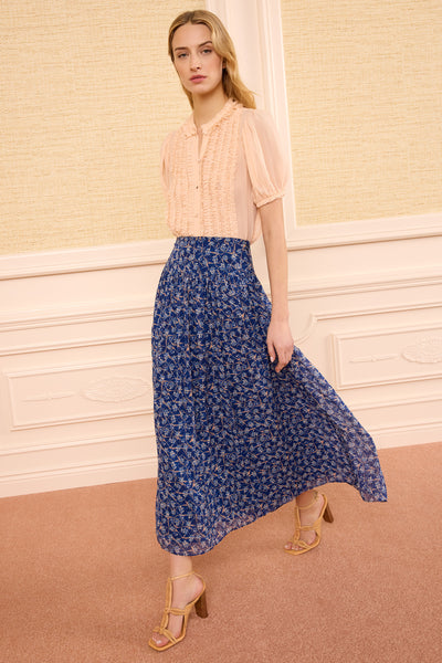 This multicolored skirt is imbued with light movement, tailored with a fixed waist that gives way to soft pleating.