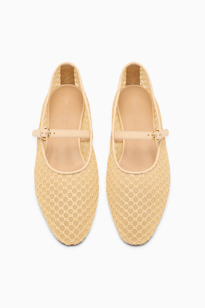 The Isobel Ballet is a wardrobe essential, elegantly crafted from raffia net in a light khaki hue. This effortless flat has a sleek, rounded silhouette with a mesh lining and is finished with supple leather trims.
