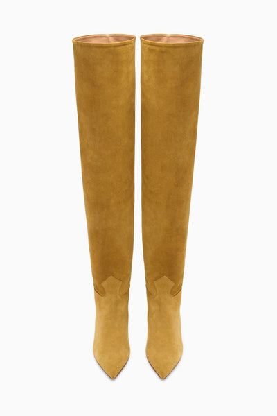 Our signature Carolina Boot is reinterpreted in black velvet with light croc embossing for a subtly textured look. Complementing our ready-to-wear, it can be styled over the knee or scrunched down, bringing versatility to this statement silhouette. It is lined in leather and rests on an effortless kitten heel.• Lightly croc-embossed velvet