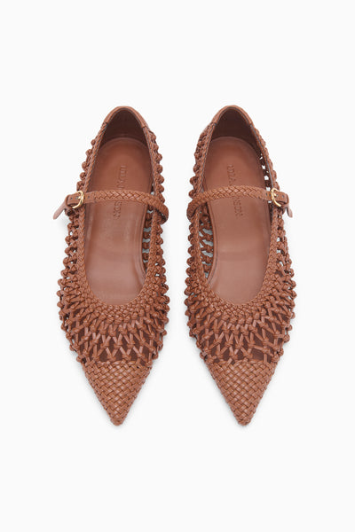 Handmade elegance arrives in the Gracie Flat, featuring a caged upper in vegan leather knotted by hand and a ballet silhouette. The chestnut brown hue is endlessly versatile.