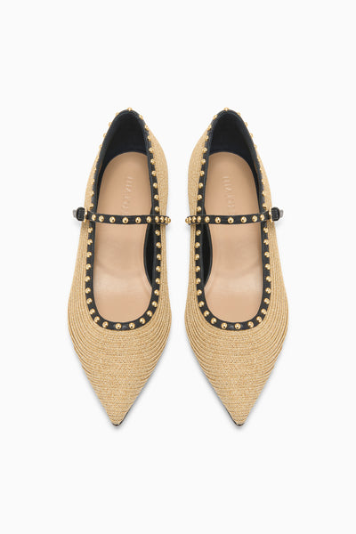 The Hera Flat is crafted in Italy from a light brown, raffia textile into a modern point-toe shape and is richly contrasted with supple, black leather trims. The brass studs add a gleaming finish to this wear-everywhere silhouette.