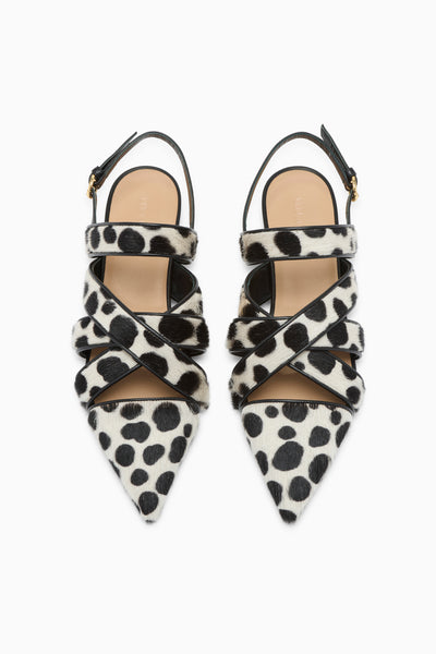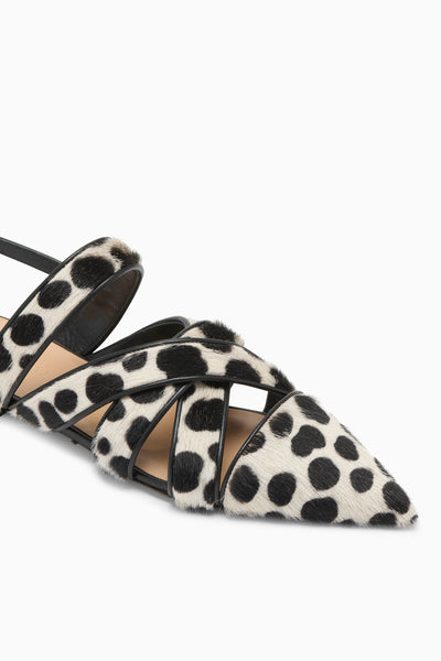 The Tallulah Flat is a sleek, yet intricate silhouette with artfully woven wide straps. Crafted from graphic black and white calf hair, it has a pointed toe silhouette that easily elevates tailoring, dresses, and denim.